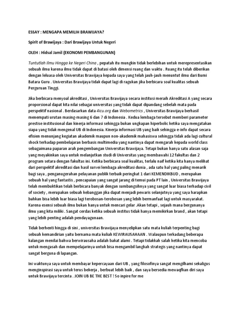 Contoh Esai Universitas Brawijaya : Universitas brawijaya (ub) malang membuka pendaftaran mahasiswa baru melalui berbagai jalur, di antaranya snmptn dan sbmptn.. Acara ini merupakan agenda tahunan kami. Contoh esai beasiswa lengkap dengan cara membuat esai yang baik ini bisa kamu pelajari untuk mempersiapkan esai beasiswa kamu! Sudah jelek, miskin, kurang cerdas, dan hidup lagi! Nama universitas brawijaya (ub) pasti tidak asing lagi buat kamu yang berstatus pelajar dan calon mahasiswa. Biaya kuliah universitas brawijaya jalur mandiri.